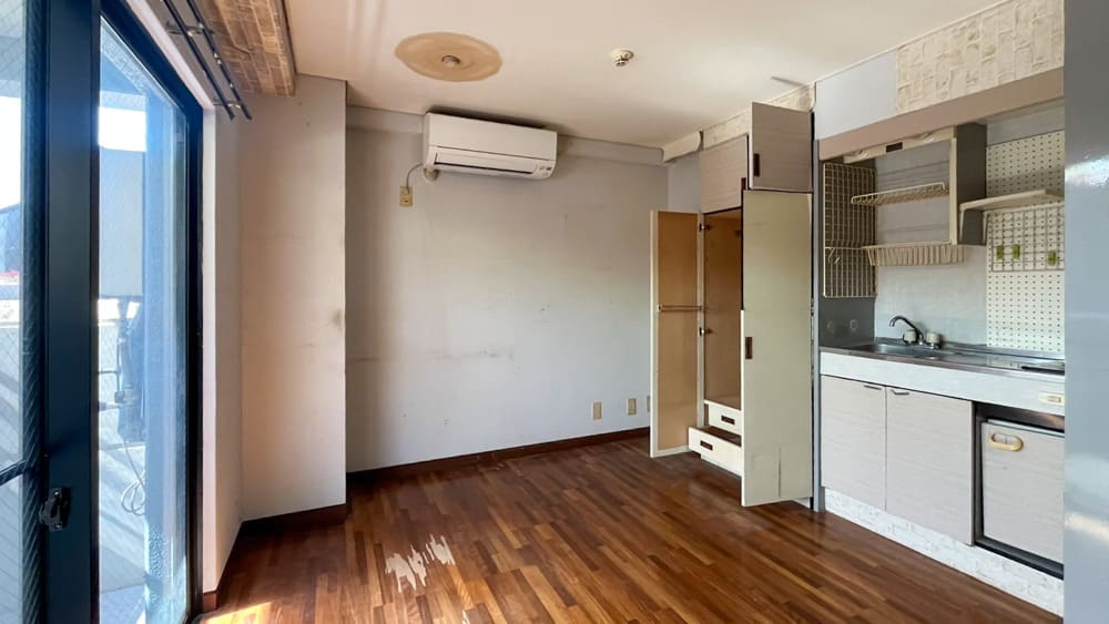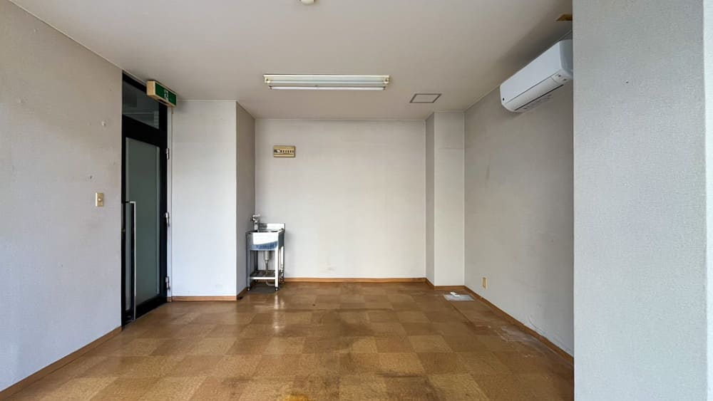 事務所はおよそ4-5坪ほどで、エアコンとシンクが残地物として残っております。エアコンは2024年製なのでまぁまぁ新し目です。ラッキーですね。個人のオフィス利用ならすでに十分ではないでしょうか。