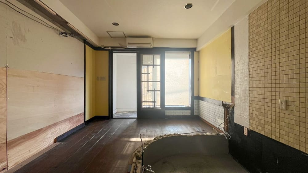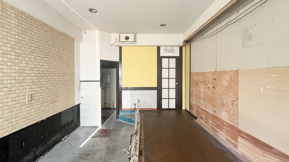 お品書きは壁に書いてしまうなんてこともアリです。デメリットは一回書くと消すのが面倒なことと、客の首を酷使するくらいなのでほぼ問題ありません。天井にダウンライトが仕込まれているということは、抜けばもうちょい高さが出るのでしょうか。天井裏が楽しみですね。というわけで、市役所前から7坪重飲食可のテナント情報でした。