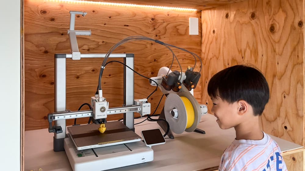 こちらは創作意欲が湧きそうな、壁一面の棚と3Dプリンターが設置された部屋。部屋自体はシンプルですがいつでもすぐに創作活動ができ、そして作ったものを飾れるクリエイターに好まれそうな空間です。