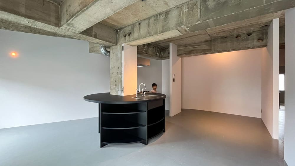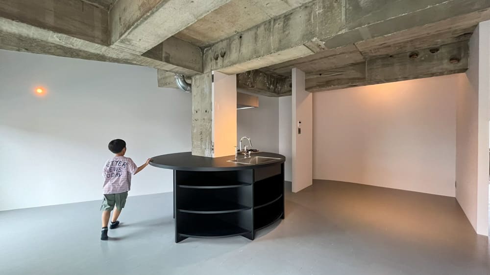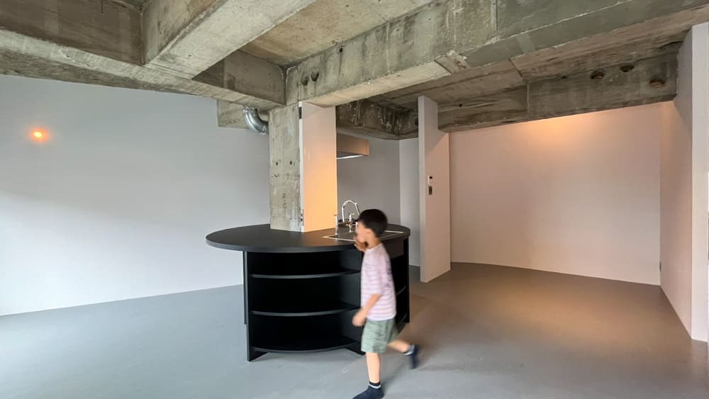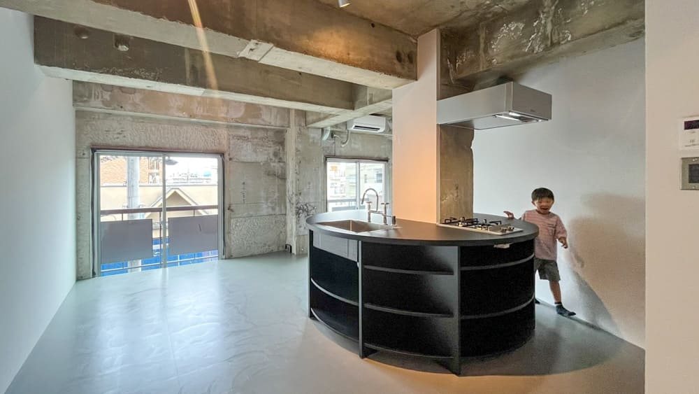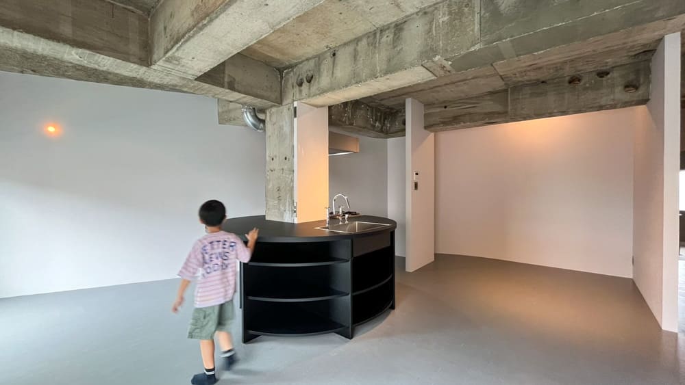 まずは副社長が一番お喜びになっていたこちらの部屋。建築士さんが手がけた空間で、部屋の中心にある円形のキッチンが印象的です。ありそうで無かった柱を囲うキッチンは、調理空間とダイニングのあり方の常識を覆す斬新なデザイン。新たな価値観に出会えた副社長は大喜びで、キッチンの周りをグルグル走り回っていました。