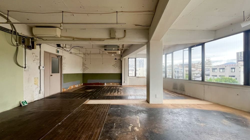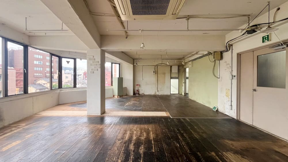 天井は抜かれており躯体が露出、足元は部屋半分がフローリング敷でダメージ感もあります。現状スケルトンですので素材だけの状態ですが、もう仕上がっていると言っても過言ではありません。余計なことはせず、このままの状態を活かしながらお店を始めるだけでも様になるでしょう。