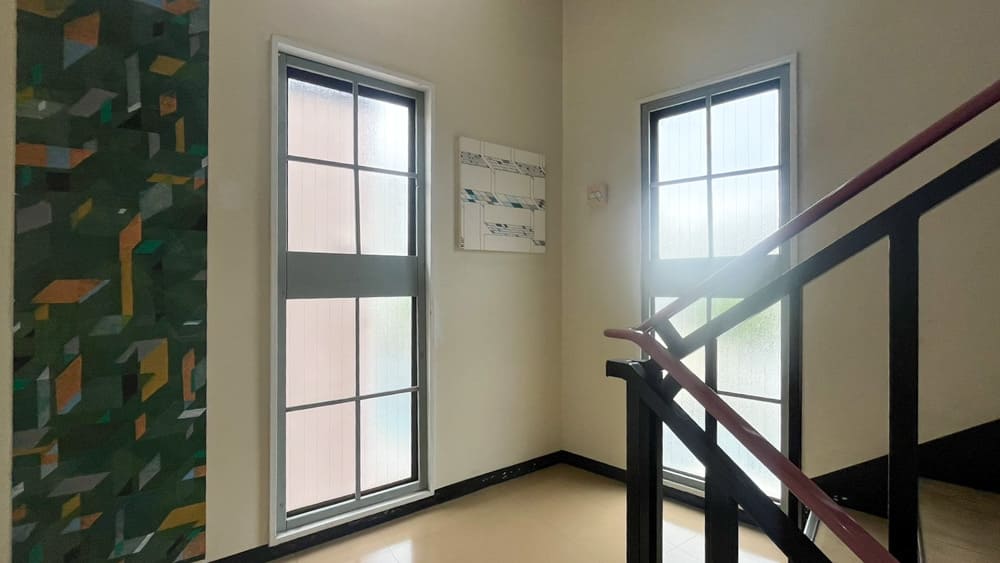 扉を開けた途端、向かいの大きな窓から外の景色が見えます。壁一面窓になっており、北向きであっても室内は明るいです。なんなら直射日光が差し込まないので夏でも暑くなりすぎません。柱は若干邪魔ではありますが、「お子様の身長が伸びてきたときにメモを残せる」と考えるとあってもいいのかなと思ったりします。