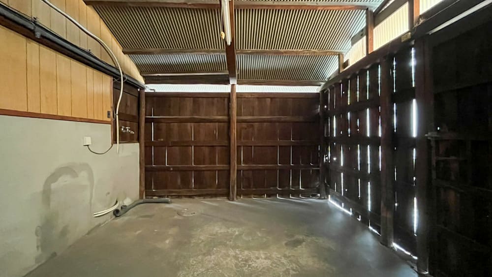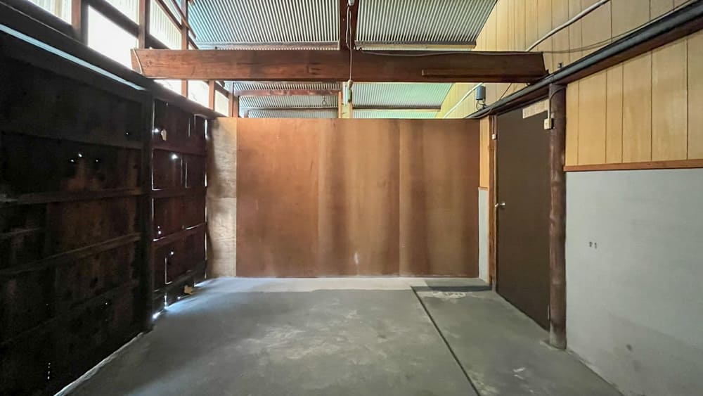 そしてリビングの扉から外へ出ると倉庫スペースに繋がっています。自転車やバイクなどはここに停めてもOKですし、洗濯機もここに設置するので屋内干しの空間としても利用してください。