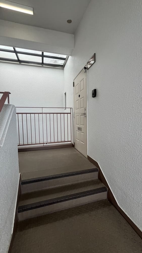 久しぶりに広いルーフバルコニー物件でも見にいこうと思い、豊中市上新田2丁目にやってきました。7階の部屋へ向かう予定がエレベーターが6階までしかボタンがありません。6階から7階は階段でのぼるタイプのマンションかと思っていましたが、ワンフロアが2段で隔たれている珍しいタイプでした。