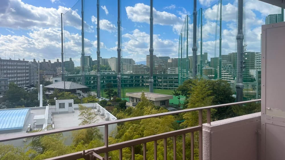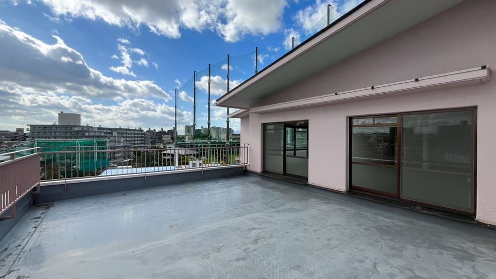 和室・キッチンからルーフバルコニーへと出ることができ、その広さは20帖ほどありそうです。バルコニーが広すぎるがゆえ本日の天気の悪さも際立ってしまっております。これだけ広かったらゴルフのスイング練習もできそうですが、そんなゴルフ好きな方に朗報です。なんと徒歩1分ほどの場所にゴルフの打ちっ放し練習場があり、気が向いた時にいつでも行くことができます。