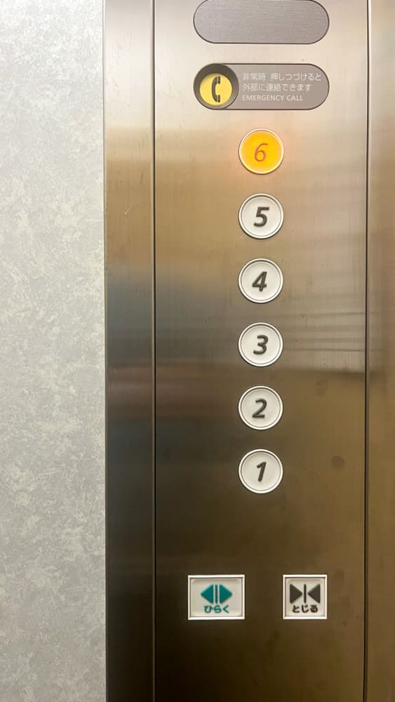 久しぶりに広いルーフバルコニー物件でも見にいこうと思い、豊中市上新田2丁目にやってきました。7階の部屋へ向かう予定がエレベーターが6階までしかボタンがありません。6階から7階は階段でのぼるタイプのマンションかと思っていましたが、ワンフロアが2段で隔たれている珍しいタイプでした。
