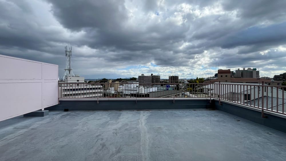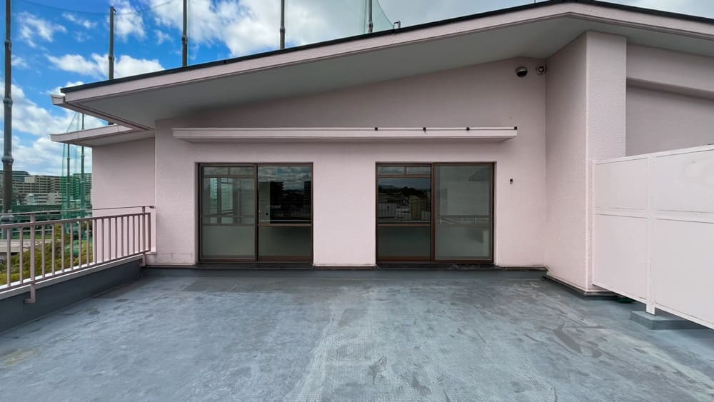 和室・キッチンからルーフバルコニーへと出ることができ、その広さは20帖ほどありそうです。バルコニーが広すぎるがゆえ本日の天気の悪さも際立ってしまっております。これだけ広かったらゴルフのスイング練習もできそうですが、そんなゴルフ好きな方に朗報です。なんと徒歩1分ほどの場所にゴルフの打ちっ放し練習場があり、気が向いた時にいつでも行くことができます。