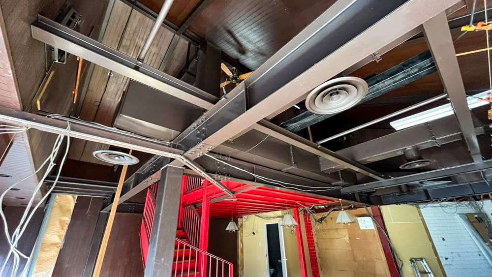 階段3階の最上階フロアのこちらの区画は、およそ27坪の中規模テナント。南向きの窓から明るい日差しが入り、広い空間でありながら温かい雰囲気。天井は取り払われ鉄骨が頭上を走り、開放感もバッチリ感じ取ることができます。