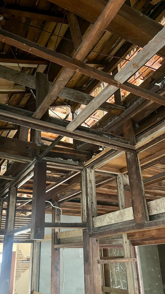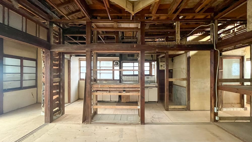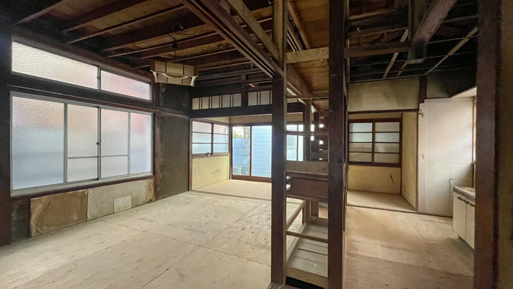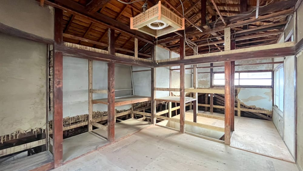 現状フルスケルトン状態ですので、飲食店を始めるならそれなりの改装が必要となります。最低でも5~600万円ほどかかりそうなので「そんなもん払えるか」という方はDIYでとことん切り詰めていきましょう。ちなみに個人的な好みとして、この天井の感じは残しておいて欲しいです。