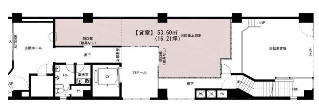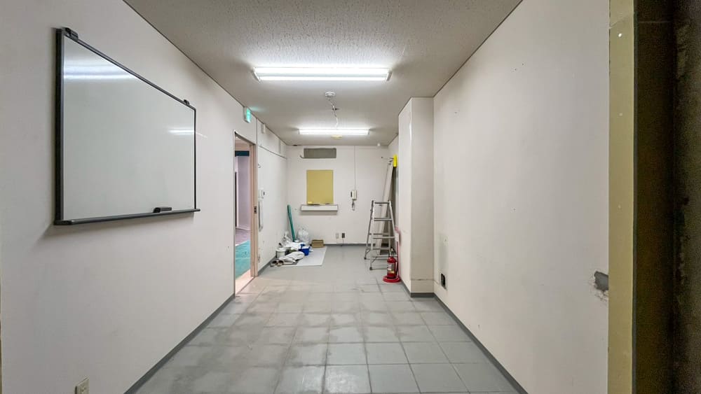 1階区画はおよそ16坪。白くて細長い事務所空間とコンクリの店舗空間がミックスされております。現状渡しなので、内覧時は内装業者の方も一緒に来ていただくことをオススメいたします。