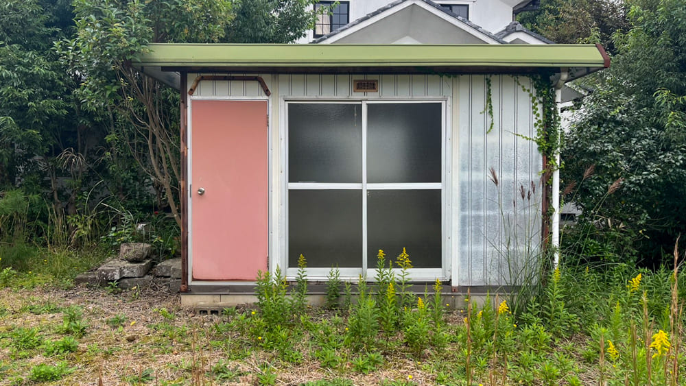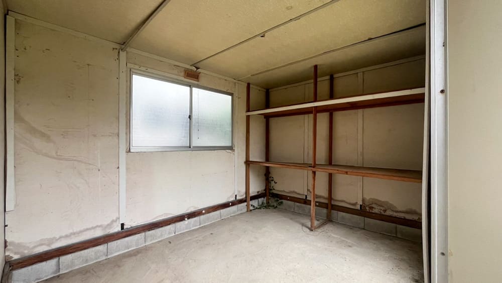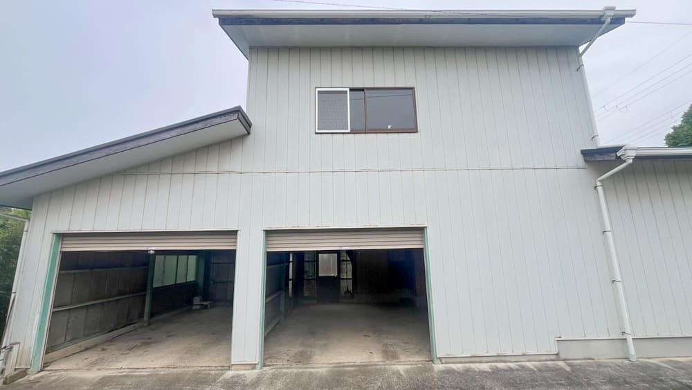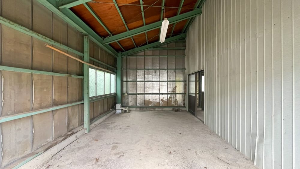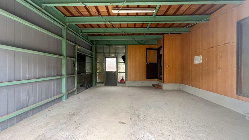 シャッターが二枚あり、二部屋に分かれています。どちらも車を入れる余裕があり、室内からもアクセス可能。田舎で暮らしたいと思う理由の一つがここにあります。