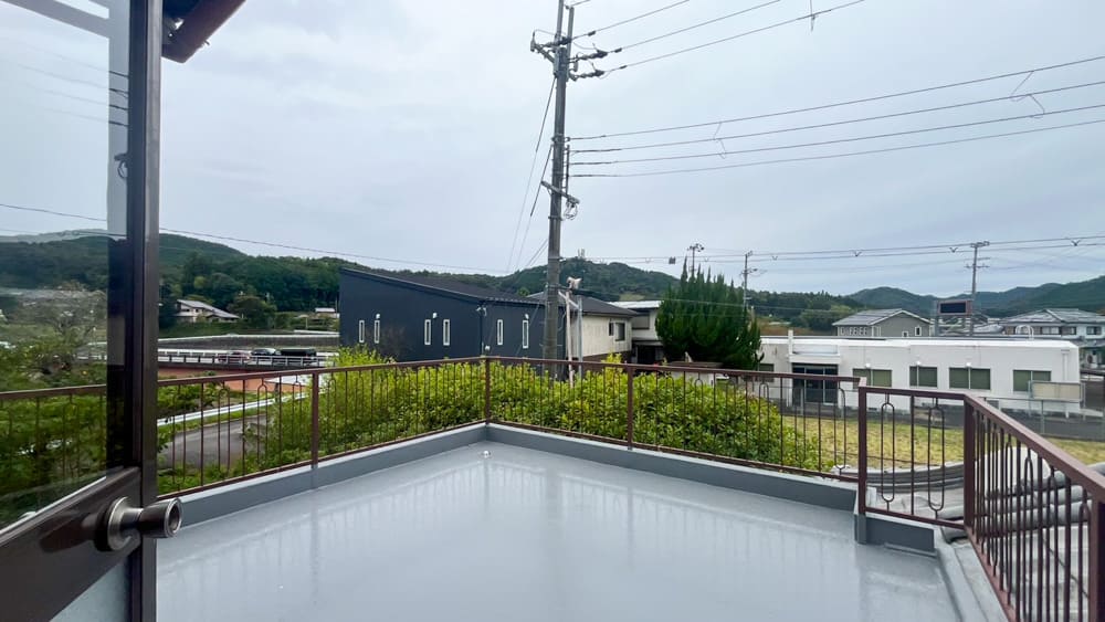 部屋の2階にはルーフバルコニーもあり、丹波の山々や隣を流れている川を眺めることができます。ちなみに庭には柿の木も生えており、撮影時期にはたくさんの実がなっていました。