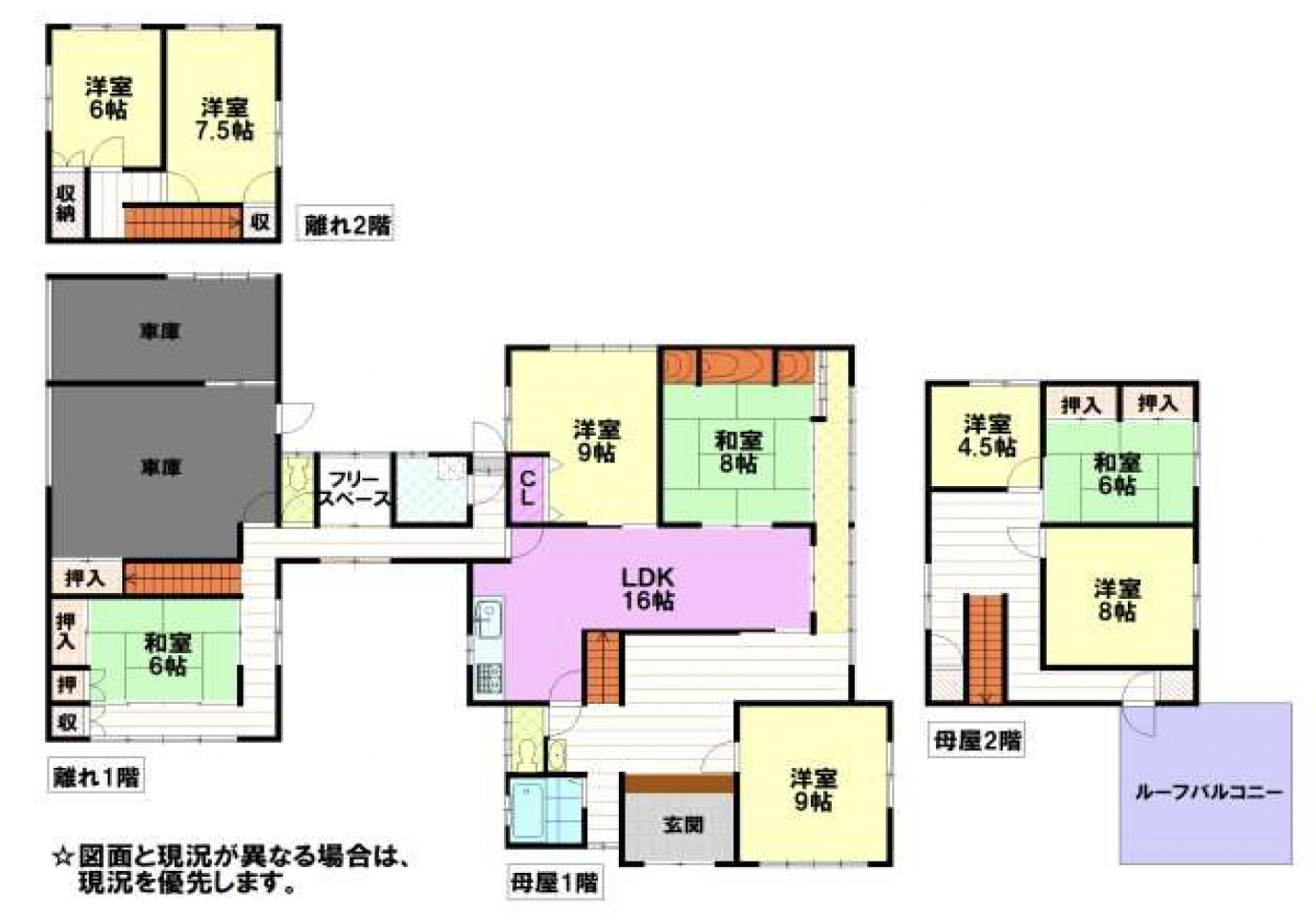 そして最後は広大な庭とルーフバルコニーの紹介です。庭も非常に広く、家庭菜園をやるにもそれなりの覚悟が必要です。どこでもドア付きの納屋は3帖ほどの物置空間とだけ繋がっておりますのでご自由にお使いください。