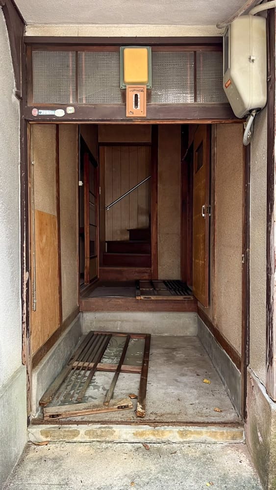 ちなみに建物は同じ間取りの連棟になっており、こちらは南側入り口。鍵が空いていると聞いてはいましたしそういうアレじゃないのは確認済みでしたが、もはや扉すらない。ここで私は思いました。「もしかしてこの物件はまだ建築途中なのかも」と。サグラダファミリア的にずっと工事をしているのであれば、100歩譲ってこの扉は納得できそうです。