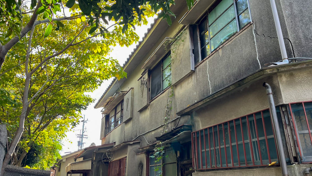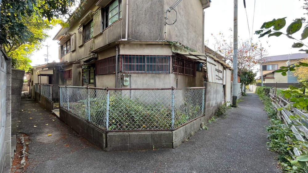 そんな裏路地を進んだ先にあるこちらの物件が今回の主役。ポジティブに言えば「角地」「味がある」と言ったところでしょうか。ネガティブに捉えるなら『誰も通らなさそうな私道に挟まれた角地』『これ以上味をつけようがないほど味がある』という感じです。