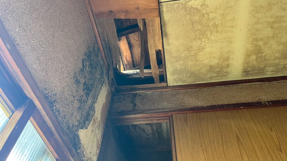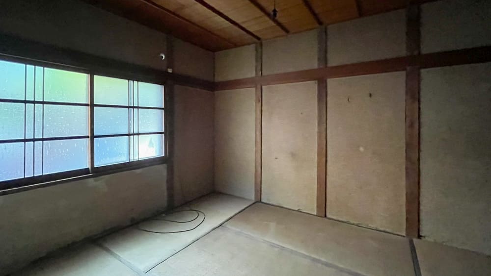 中はホラゲーの舞台にでもなってそうなボロさと暗さ。子供なら泣いてます。3DKの間取りはどこも和室で畳が年季でフカフカでした。こんなに嫌なフカフカってあるんですね。また、廊下も天井の一部が落ちている形跡があり、この先何が起きても不思議じゃないポテンシャルを感じました。