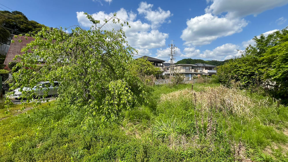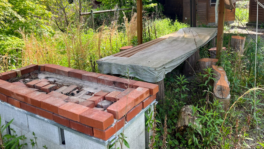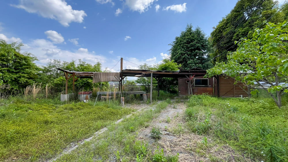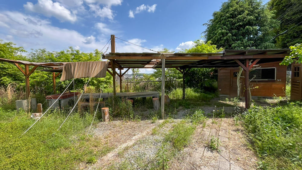 簡易な屋根の下ではBBQなどを楽しめます。また、今は草が生い茂っておりますが例えばここを広場に、もしくは畑にするのもアリですね。周りに住戸が建っておりますので騒音などにはご注意ください。